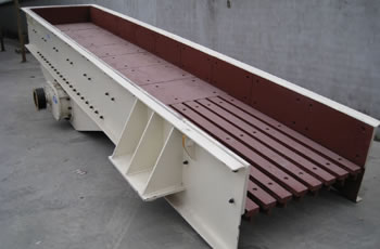 该设备主要是由激振器、弹簧、振动支架和振动装置等部件组成。其中设备的激振器是由两个特定位置的偏心轴和齿轮组成,装配时必须使两齿轮按规定的标记相互咬合啮合,并且通过电机驱动,使得两个偏心轴不停旋转,从而产生巨大的直线激振力,*终使得机体在支承弹簧的作用下做强制性振动,而物料则以此振动为动力,在料槽上做滑动及抛掷式运动,*终向前移动达到给料目的。当物料通过棒条式出料口时,较小的物料可通过间隙而落下,大块物料将进入下一道破碎工序。